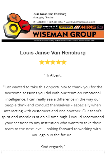 The Agricultural High School in Jacobsdal would like to salute Mr. Wille for his presentation on emotional intelligence. The way that you worked with the learners and the calmness that you brought had a huge effect on the learners. In your sessions, you mentioned many things that learners can relate to when they want to make a difference in their own lives. I will motivate all schools to make use of Mr. Wille and his mind prosperity programme. It made a huge difference in the lives of our learners.